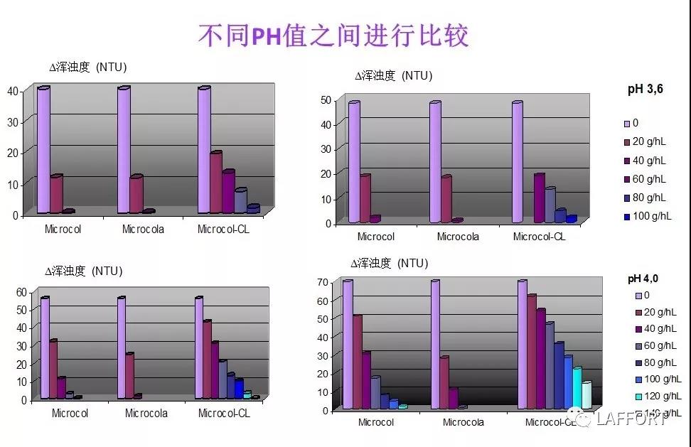 從以上四個(gè)圖表中我們可以看出,從pH=3,6開始Microcol ALPHA產(chǎn)品的吸附能力明顯要強(qiáng)于另外兩個(gè)產(chǎn)品。Microcol ALPHA產(chǎn)品可以吸附葡萄酒中含電荷數(shù)非常少的蛋白質(zhì)物質(zhì)。