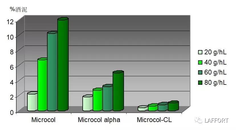 從圖表中我們可以看出, Microcol-CLG 產(chǎn)品或者M(jìn)icrocol-ALPHA 產(chǎn)品在葡萄酒澄清過程中形成的酒泥的體積百分比量要小于Microcol-p產(chǎn)品。在澄清葡萄果汁時(shí),我們推薦使用Microcol CL產(chǎn)品來增強(qiáng)酒泥結(jié)合的緊密度,從而降低酒泥體積百分比含量 。