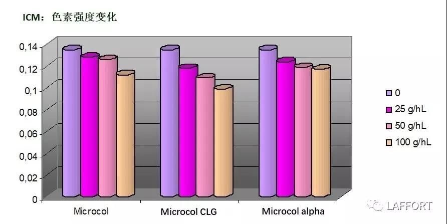 通過上圖我們可以看出在使用Microcol ALPHA 產(chǎn)品后,葡萄酒的顏色強(qiáng)度變化量最少;而Microcol CLG產(chǎn)品的保護(hù)色素物質(zhì)的能力就要相對弱一些。