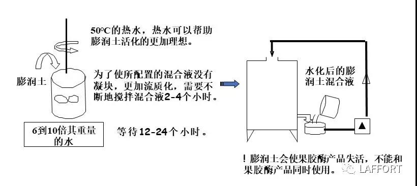 為了能夠最大程度的發(fā)揮膨潤土產(chǎn)品的作用,如何水化好膨潤土產(chǎn)品是非常關(guān)鍵的;水化的越理想,膨潤土產(chǎn)品吸附不穩(wěn)定蛋白質(zhì)的能力就越強(qiáng)。雖然在水化過程中我們會感到非常枯燥乏味,但是這個(gè)過程是必不可少的,準(zhǔn)備工作做的越好,產(chǎn)品的使用量就越少、處理中損失的葡萄酒就越少和保護(hù)葡萄酒的芳香特征的能力就越強(qiáng)。