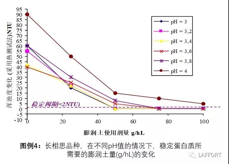 在 pH= 3,4 的時候,需要使用膨潤土50g/hL來穩(wěn)定蛋白質(zhì);在pH=3,6時,需要使用膨潤土75g/hL來穩(wěn)定蛋白質(zhì);而在pH=4的時候,我們可以看到使用劑量達到100g/hL也不能起到穩(wěn)定蛋白質(zhì)的效果。